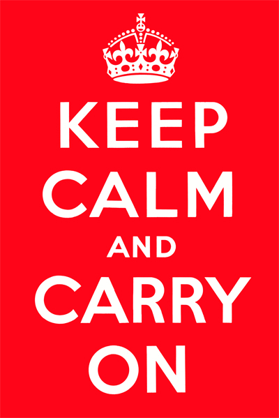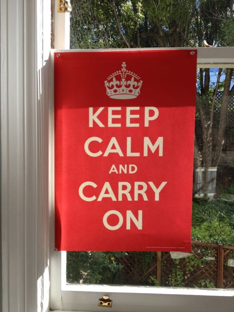 And what an effect those words had. Keep Calm and Carry On. This tells me exactly what every writer needs to do at almost every moment of his or her life. Keep Calm, but please, yes, if you can get around to it, and if the muse strikes you, and if you don’t have a million other things you’d rather be engaged in like sorting your socks or planning next year’s Christmas party, do indeed Carry On. Every writer should have these words emblazoned on his or her soul, or, as I do, tacked to my garden window, which is just at the edge of my vision so I always know it is there, a crimson icon of benevolent grace. Apparently the poster had long ago taken on all of England. You will see it at hospital nursing stations, banks, colleges, sporting facilities, and doubtless over the Queen’s bed. It has appeared, according to Wikipedia, at 10 Downing Street, Buckingham Palace, and the American Embassy. It’s become so popular in England that another company tried to hijack it and trademark the name for themselves and a great and nasty trade war has ensued (and continues to this day). What a tragedy! Because now nobody in England is actually keeping calm, although I understand there is still a great deal of carrying on.